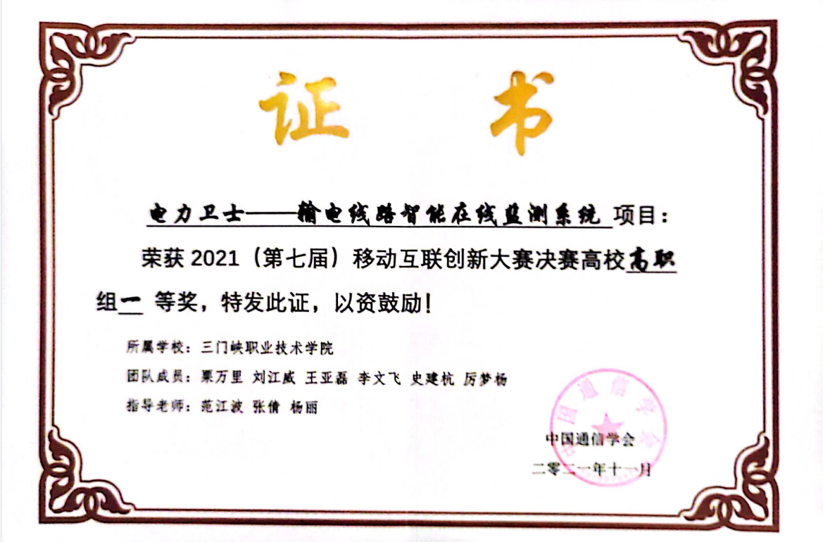 2022年栗万里等参加十七届全国“挑战杯”大学生课外学术科技作品竞赛《电力卫士--输电线路智能在线监测系统》项目获国赛三等奖