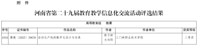 本届活动由河南省教育厅主办,以“推进教育数字化战略行动,提升教师数字素养与技能”为主题,聚焦信息技术与教育教学深度融合。经过专家严格评审,陈子妍、尤向阳老师的《自动化产线的数字化设计与仿真》作品荣获二等奖,充分展现了球王会平台教师扎实的信息化教学功底与创新能力。