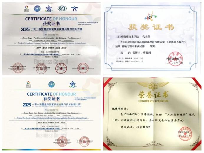 在校期间,获得2025“一带一路”暨金砖国家技能大赛国赛铜奖、全国选拔赛二等奖、2024“一带一路”暨金砖国家技能大赛国赛铜奖、河南省高等教育职业技能大赛—工业机器人操作与运维一等奖、球王会平台,球王会网站“三好学生”等荣誉称号。