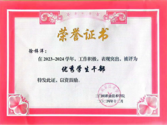 作为班级班长,徐梓洋充当着教师与学生间的桥梁,恪尽职守、务实笃行,积极服务同学、协助教师开展工作。他主动分享学习经验,耐心为同学答疑解惑,以实际行动推动班级整体进步,在他的带领以及全班同学的共同努力下,班级因班风端正、学风优良荣获“先进班集体”称号。