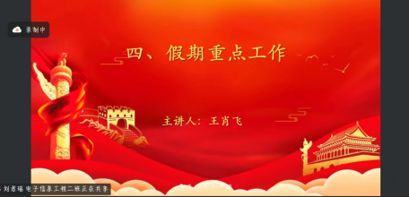 会议第四项,王肖飞同志围绕假期重点工作作出部署安排,明确假期重点推进六项工作:复盘回迁全流程问题;做好学生假期安全提醒与常态化线上教育,关注特殊学生;组织学干开展各类实践文化活动;抓实参军入伍督促教育;启动 24 级专升本报名与班级组建;推进实习就业线上工作,确保 3 月底就业落实率达标。