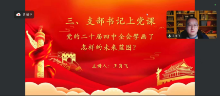 会议第三项,王肖飞同志以“党的二十届四中全会擘画了怎样的未来蓝图”为题上专题党课,他从全会召开的时代背景、核心要义、实践要求等方面展开,结合学院学科建设、人才培养等工作实际分享学习感悟,引导党员把个人发展融入国家战略,在教育教学一线担当作为。